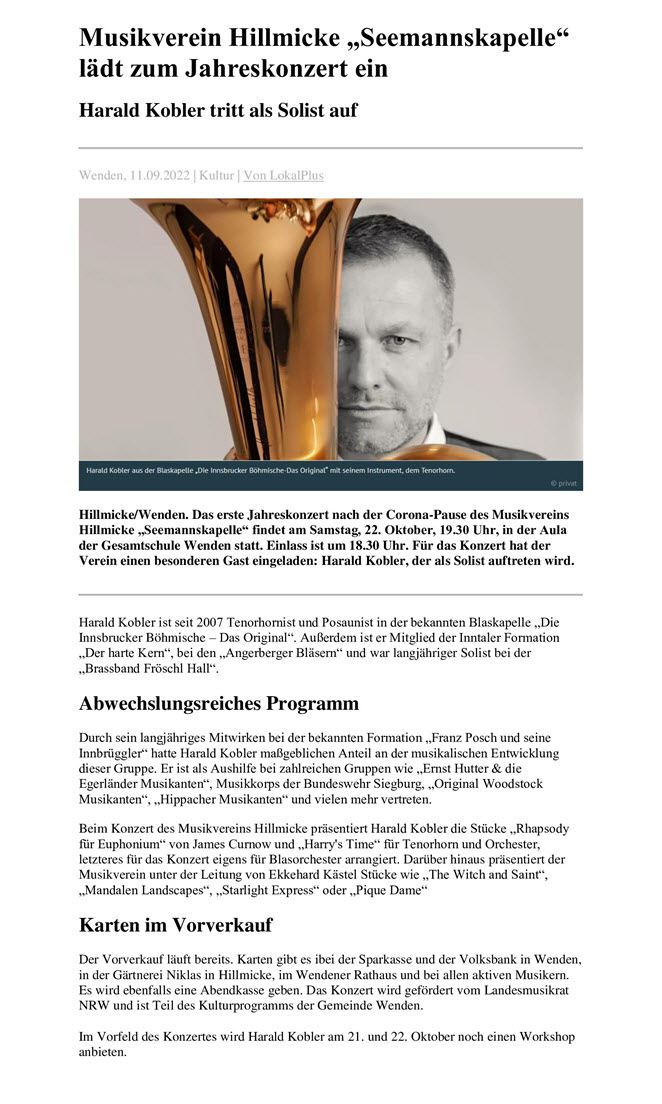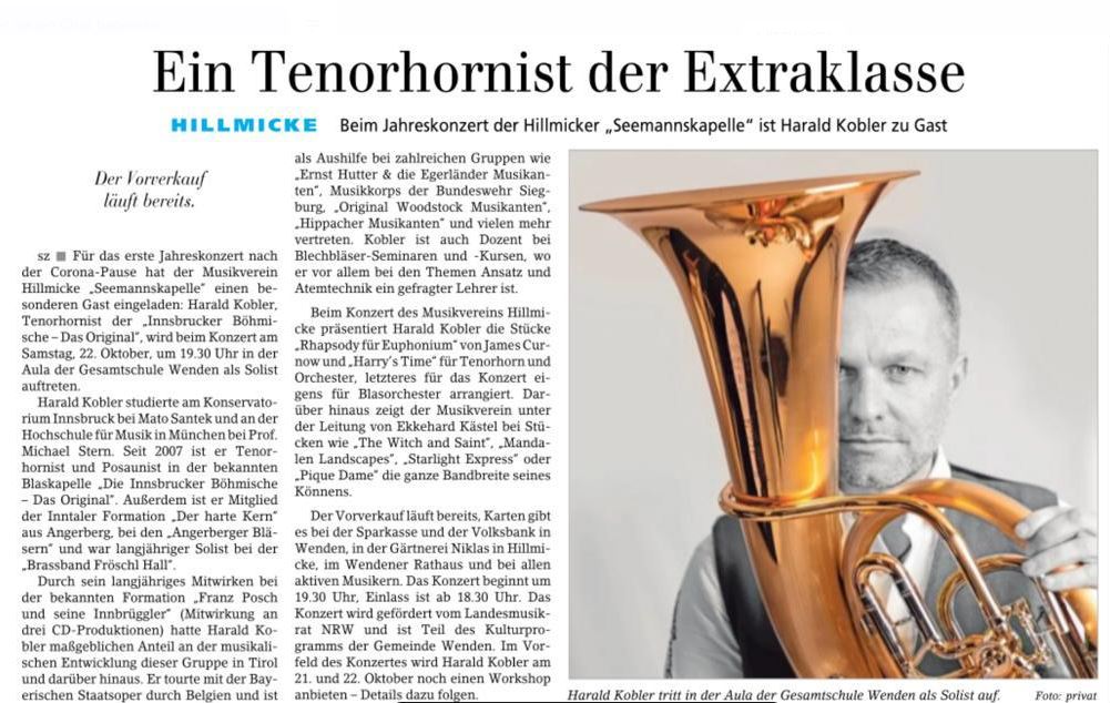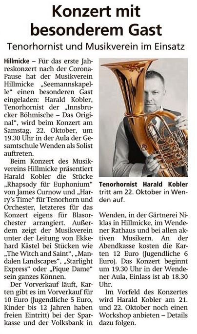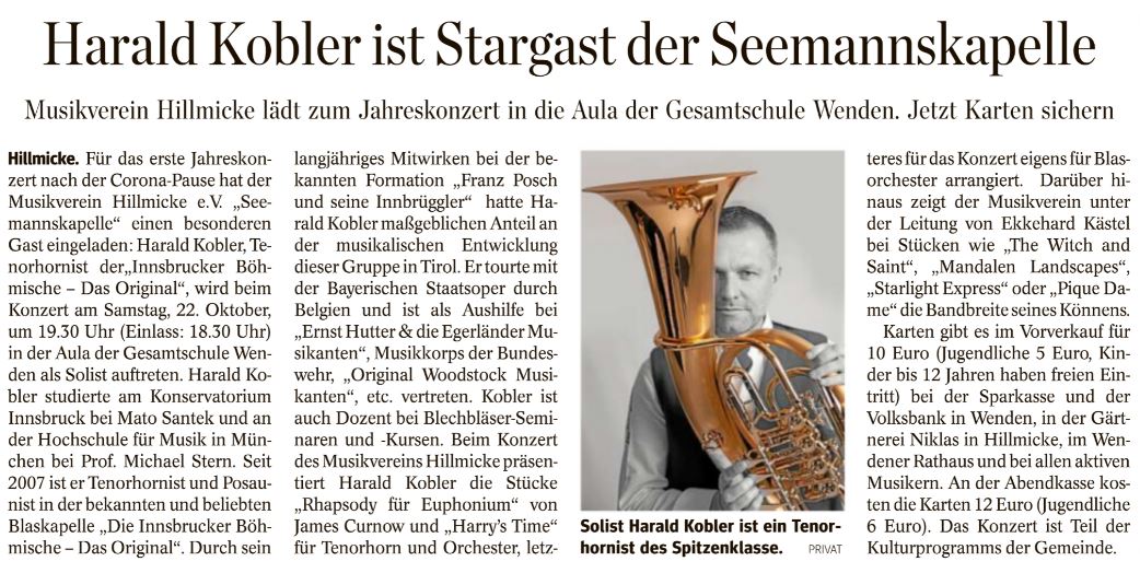Wir freuen uns sehr, nach der Corona-Pause wieder ein Konzert austragen zu dürfen. Dazu haben wir Harald Kobler, Tenorhornist und Posaunist der bekannten Blaskapelle "Die Innsbrucker Böhmische - Das Original" als Solist gewinnen können. Er wird die Stücke "Rhapsody für Euphonium" von James Curnow, "You Raise Me Up" von Rolf Løvland und "Harry's Time" von Mathias Rauch für Tenorhorn und Orchester präsentieren. Letzteres wurde eigens für Blasorchester arrangiert. Ein sehr anspruchsvolles und schwieriges Solo, das dem Solisten alles abverlangt. "You Raise Me Up" wurde von userem langjährigen Mitglied/Baritonisten und ehemals 1. Vorsitzenden Michael Sauer arrangiert.